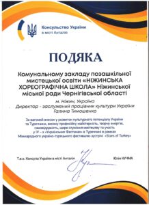 Днями з вагомими творчими здобутками до Ніжина повернулися творчі колективи Ніжинської хореографічної школи – учасники «УКРАЇНСЬКИХ ФЕСТИН В ТУРЕЧЧИНІ» (м. Анталія).