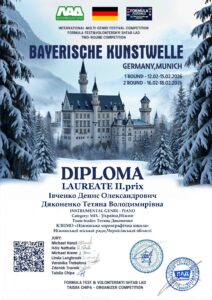 З блискучою перемогою – LAUREATE II PRIX у номінації «Інструментальний жанр. Фортепіано» Міжнародного благодійного двотурового конкурсу мистецтв «Baverische Kunstwelle – Баварська мистецька хвиля» (Україна – Німеччина, Мюнхен, 12-18.02.2026)